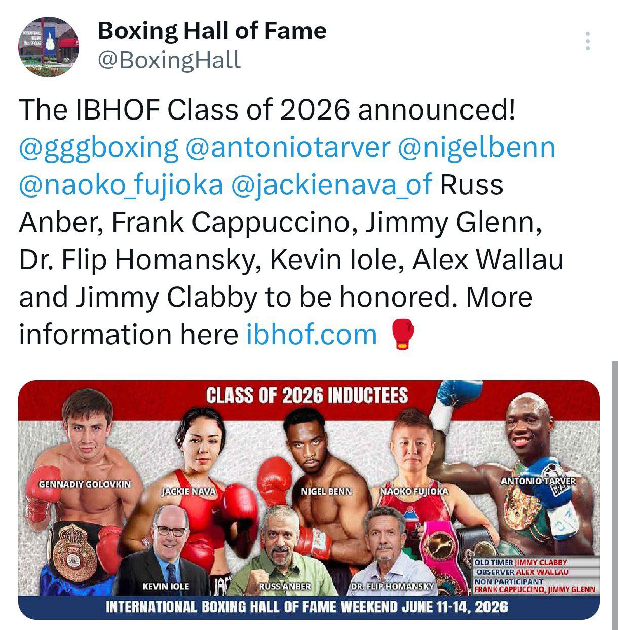 Геннадий Головкин официально включён в Международный зал славы бокса и стал первым казахстанцем, удостоенным такого признания. Церемония введения пройдёт в Канастоте, штат Нью-Йорк, в период с 11 по 14 июня 2026 года. Голосование за кандидатов 2025 года проходило среди журналистов и историков бокса из разных стран — США, Японии, Англии, Канады, Аргентины, Австралии, Нидерландов, Германии и Мексики. Конкуренцию Головкину составили Вернон Форрест, Стив Коллинс и ряд боксёров, которые ранее уже номинировались, но не были выбраны.