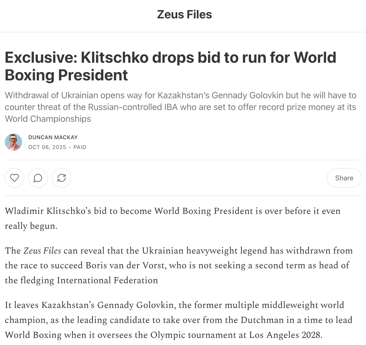 По сведениям The Zeus Files, Кличко снял свою кандидатуру ещё до старта активной кампании. Освобождающееся кресло главы организации станет вакантным после ухода Бориса ван дер Ворста, который не планирует переизбираться.