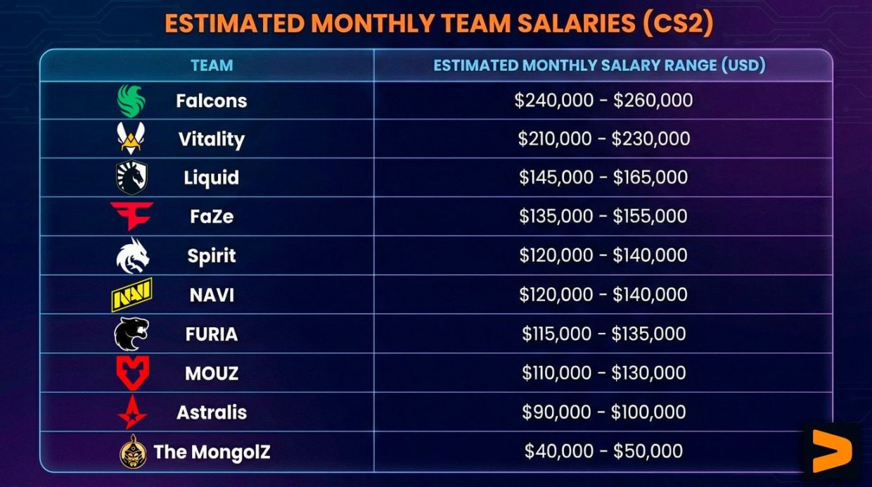 Платформа Playgg опубликовала оценочные данные по зарплатным ведомостям ведущих команд в дисциплине Counter-Strike 2. Согласно представленному отчету, наибольшие ежемесячные расходы на оплату труда игроков и тренеров зафиксированы у Team Falcons. По оценкам источника, саудовский клуб тратит около 240 тысяч долларов в месяц на состав и тренерский штаб. В среднем на одного игрока или тренера приходится порядка 40 тысяч долларов ежемесячно.