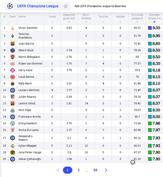 После четырёх сыгранных туров 22-летний вратарь получил среднюю оценку 8,95, что позволило ему занять вторую строчку рейтинга лучших футболистов турнира. Лидирует нападающий «Галатасарая» Виктор Осимхен (9,00), а третье место досталось киперу «Барселоны» Жуану Гарсии (8,80).