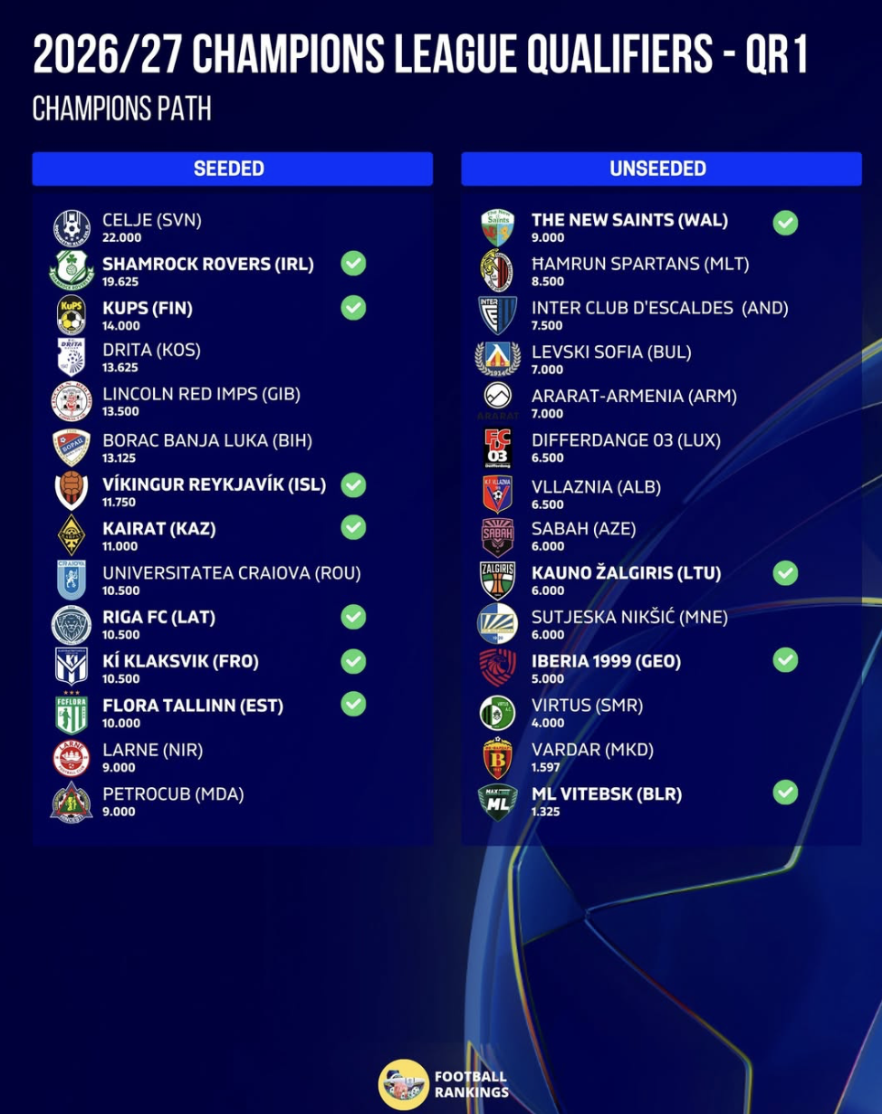 Портал Footrankings опубликовал прогнозируемый список клубов, которые могут принять участие в первом квалификационном раунде Лиги чемпионов сезона-2026/2027. Среди потенциальных участников значится и чемпион Казахстана 2025 года — алматинский «Кайрат». Согласно опубликованным данным, команды на старте отбора разделены на две корзины — сеяных и несеяных. На данный момент участие в жеребьевке первого квалификационного раунда уже гарантировано 11 клубам.