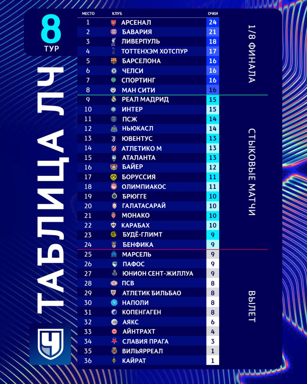 Лондонцы завершили общий этап без потерь, выиграв все восемь встреч и набрав 24 очка. «Кайрат» финишировал последним среди 36 команд с одним баллом, добытым в домашней игре против «Пафоса».