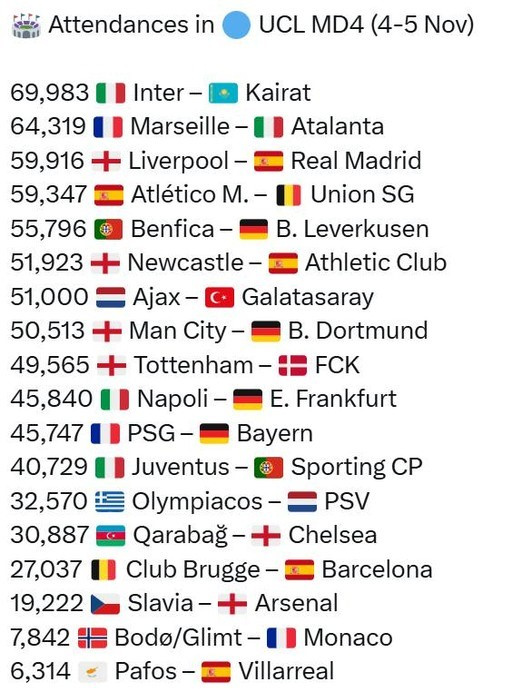 Встреча между миланским «Интером» и алматинским «Кайратом» в рамках четвёртого тура общего этапа Лиги чемпионов (2:1) стала самой посещаемой в туре. На трибунах стадиона «Сан-Сиро» присутствовали 69 983 зрителя. По данным «Football Meets Data», второе место по посещаемости заняла встреча «Марселя» с «Аталантой» — 64 319 болельщиков. На третьей строчке расположился матч «Ливерпуля» против «Реала» (59 916).