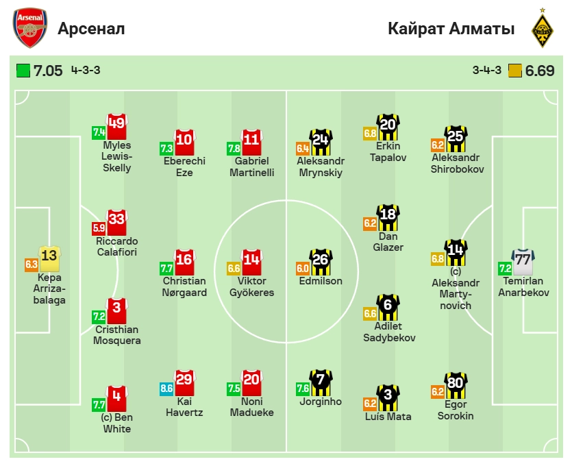 Аналитический портал SofaScore опубликовал рейтинги игроков встречи восьмого тура общего этапа, которая завершилась победой лондонского клуба со счетом 3:2. 24-летний нападающий алматинцев появился на поле на 59-й минуте и отметился забитым мячом, что позволило ему заработать 7,7 балла — лучший показатель в составе казахстанской команды.