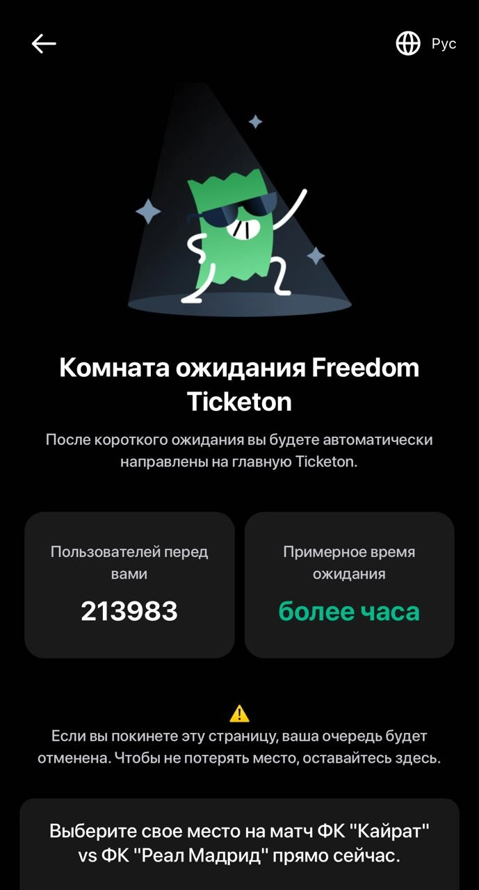 Продажа началась 23 сентября в 17:00, и уже через несколько минут сайт клуба перестал открываться из-за перегрузки. Официального заявления о приостановке пока не делали ни представители «Кайрата», ни Freedom Ticketon. По состоянию на 17:00 в электронной очереди находилось около 140 тысяч пользователей, а число желающих продолжало быстро расти.