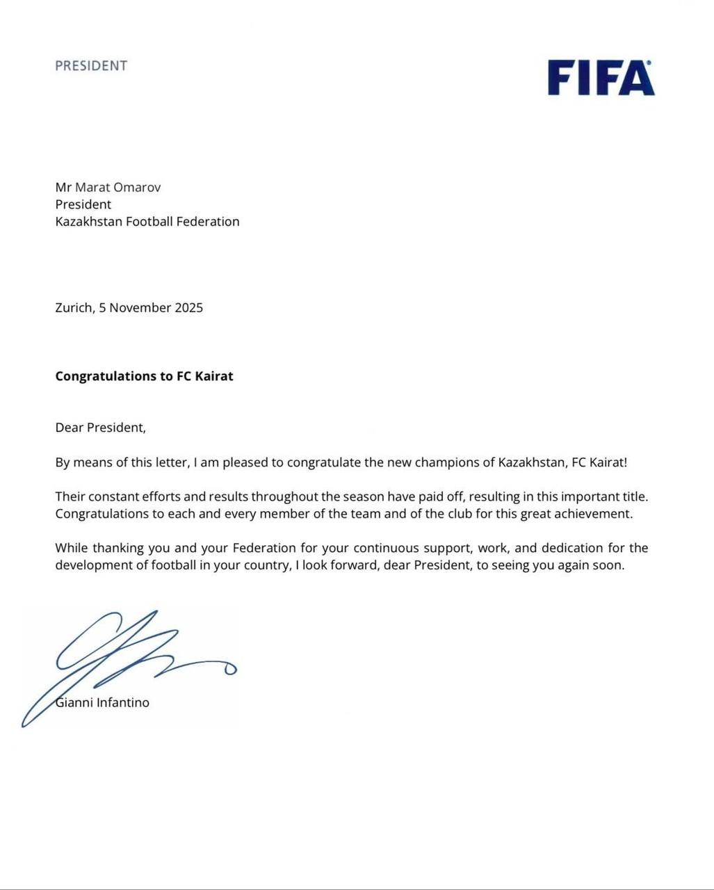 Глава ФИФА Джанни Инфантино направил поздравление алматинскому «Кайрату», ставшему чемпионом Казахстана по футболу в сезоне-2025. В официальном письме глава международной федерации отметил заслуги команды и подчеркнул важность командной работы, которая позволила клубу добиться высоких результатов.