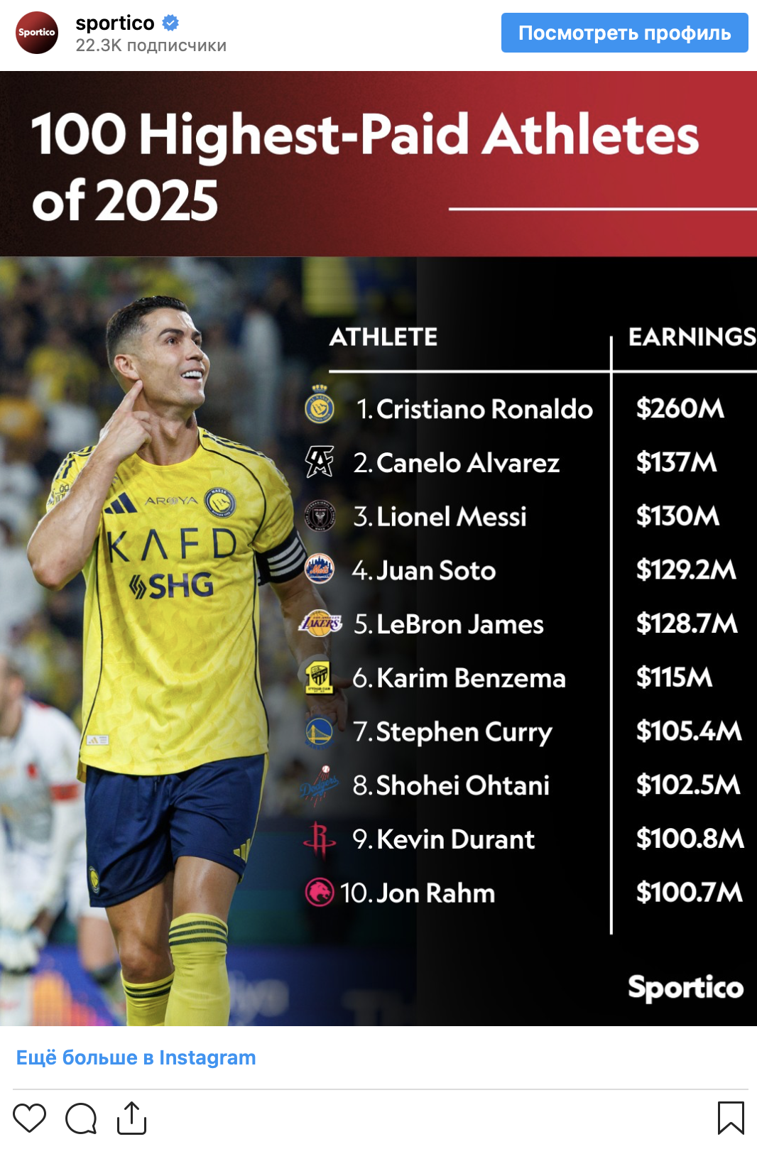 Форвард «Аль-Насра» Криштиану Роналду по итогам 2025 года стал самым высокооплачиваемым спортсменом планеты. Согласно данным Sportico, суммарный доход португальца составил 260 миллионов долларов. В указанную сумму вошли зарплатные выплаты, призовые, а также доходы от рекламных контрактов и коммерческих соглашений. По этому показателю Роналду значительно опередил остальных представителей мирового спорта.