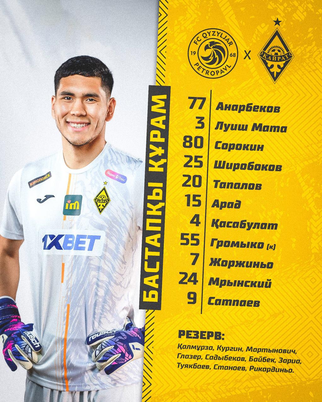 Главный тренер «Кайрата» Рафаэль Уразбахтин определил стартовый состав команды. С первых минут на поле выйдут Анарбеков, Мата, Сорокин, Широбоков, Тапалов, Арад, Касабулат, Громыко, Жоржиньо, Мрынский и Сатпаев.