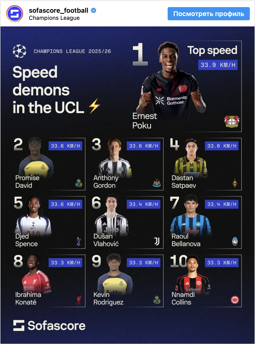 Казахстанский нападающий «Кайрата» продемонстрировал впечатляющий показатель — 33,6 км/ч, что позволило ему войти в пятёрку самых быстрых футболистов престижного турнира. Данные предоставлены аналитической платформой SofaScore.