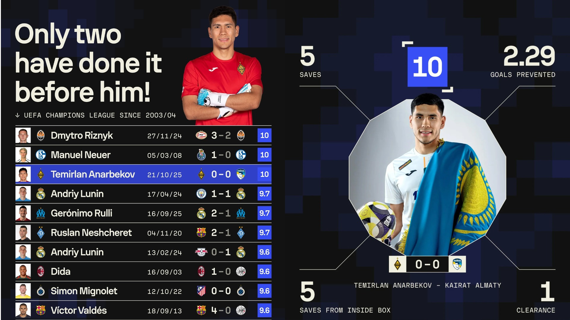 «Какой вечер выдался у Темирлана Анарбекова! Не только потому, что он дебютировал в Лиге Чемпионов, пропустив первые два матча „Кайрата“ из-за травмы, но и потому, что 22-летний казахстанец стал всего третьим вратарём в нашей базе данных Лиги Чемпионов, получившим идеальную оценку – 10 баллов!», – отмечает SofaScore.