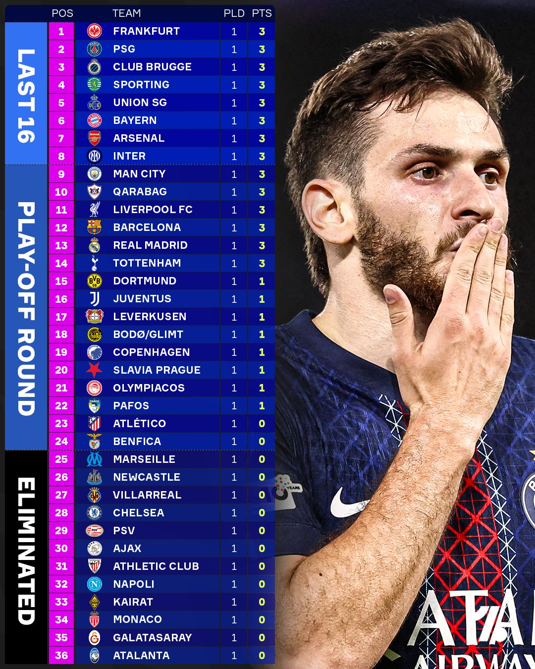 Заключительные матчи стартового тура группового этапа Лиги чемпионов прошли вечером 18 сентября и ночью 19-го. Казахстанский "Кайрат" сумел продержаться против "Спортинга" лишь до 44-й минуты, после чего рухнул под натиском хозяев. Единственным светлым пятном стал 18-летний вратарь Шерхан Калмурза, который отразил пенальти, и гол Эдмилсона, вышедшего со скамейки. Итог — разгром 1:4.