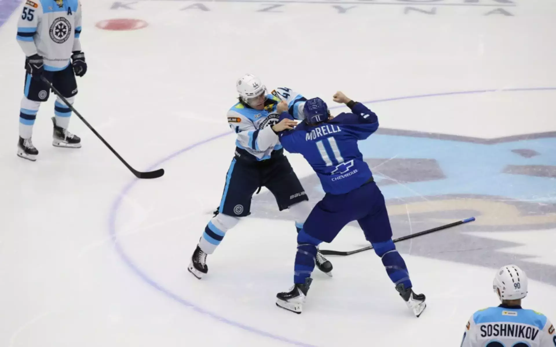 На матче регулярного чемпионата КХЛ между «Барысом» и «Сибирью» в Астане произошла драка сразу после стартового вбрасывания.