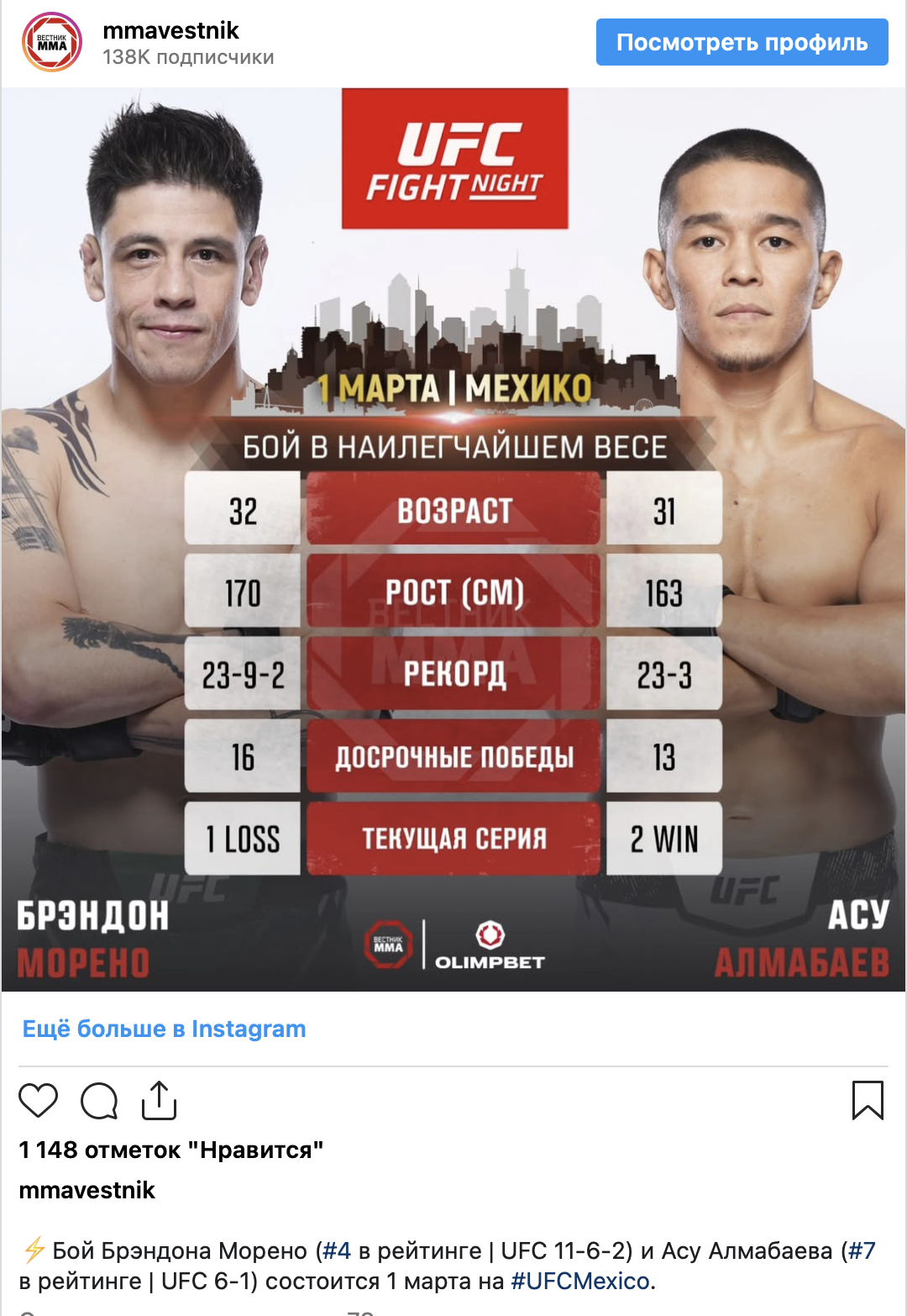 Казахстанский спортсмен Асу Алмабаев вновь появится в октагоне 1 марта на турнире UFC Fight Night 269, который пройдёт в Мехико. Его соперником станет один из лидеров наилегчайшего веса UFC — мексиканец Брэндон Морено.