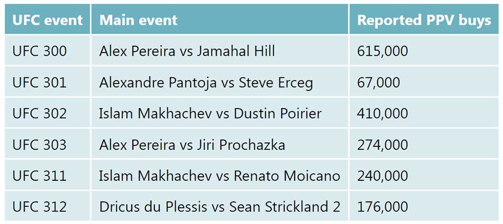 Согласно опубликованной информации, самым успешным турниром за указанный период стал UFC 300, главным событием которого был титульный бой в полутяжелом весе между Алексом Перейрой и Джамалом Хиллом. Турнир собрал около 615 тысяч платных трансляций.