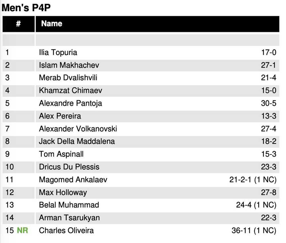 Бразилец занял 15-ю позицию в рейтинге вне зависимости от весовых категорий, сместив с нее Шавката Рахмонова. В легком весе Оливейра поднялся на третью строчку, обогнав Макса Холловэя, который может стать его следующим соперником. Тем временем британец Пэдди Пимблетт, несмотря на отсутствие боев с апреля, поднялся на шестое место, вытеснив Дэна Хукера.