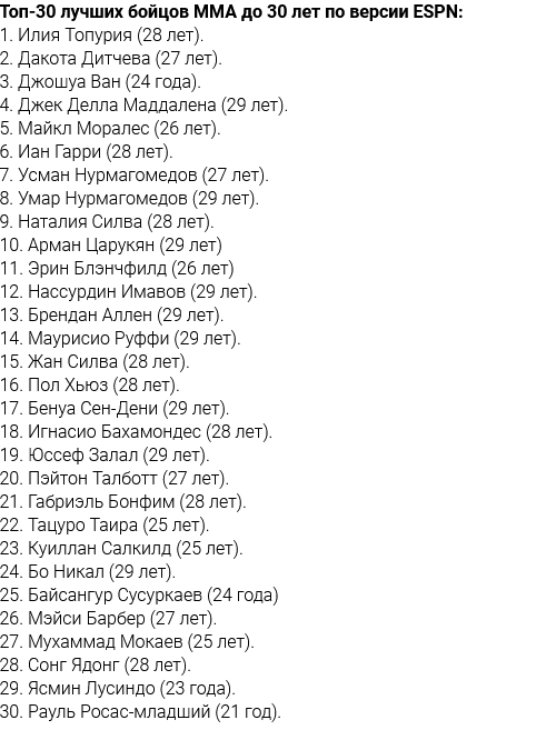 Американское издание опубликовало обновленный список из 30 перспективных атлетов смешанных единоборств. Первое место занял 28-летний Илия Топурия, за ним расположилась британка Дакота Дитчева. Третьей строкой рейтинга отмечен чемпион дивизиона UFC Джошуа Ван. В топ-пятерку также включены Джек Делла Маддалена и Майкл Моралес.