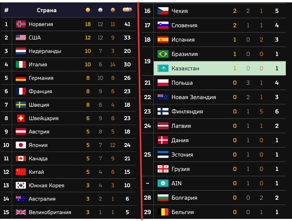 Сборная Казахстана завершила зимние Олимпийские игры 2026 года на 19-й строчке медального зачета. Призерами соревнований стали представители 29 стран. В общей сложности в Италии было разыграно 116 комплектов медалей. Победителем зачета стала Норвегия, установившая новый рекорд по количеству наград — 41 медаль (18 золотых, 12 серебряных и 11 бронзовых). Норвежцы превзошли собственное достижение Олимпиады-2018, где завоевали 39 наград.